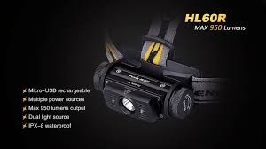 El frontal HL60R incorpora como novedad respecto al HL55 un puerto micro USB para cargarlo en cualquier lugar. Puede entregar una potencia máxima de 950 lúmenes, la viga del haz de luz es capaz de alcanzar 116 metros y el modo de intensidad más bajo permite 100 horas de iluminación con solo una batería de Ion-litio recargable 18650. Este frontal equipa un Led blanco neutro para una mejor reproducción de los colores y penetración en situaciones de niebla, lluvia o humo, así como un botón lateral para activar los cinco modos de salida y un modo de luz de alerta roja. El frontal HL60R está fabricado con un cuerpo de aluminio, es un todoterreno irrompible con una protección IPX8.